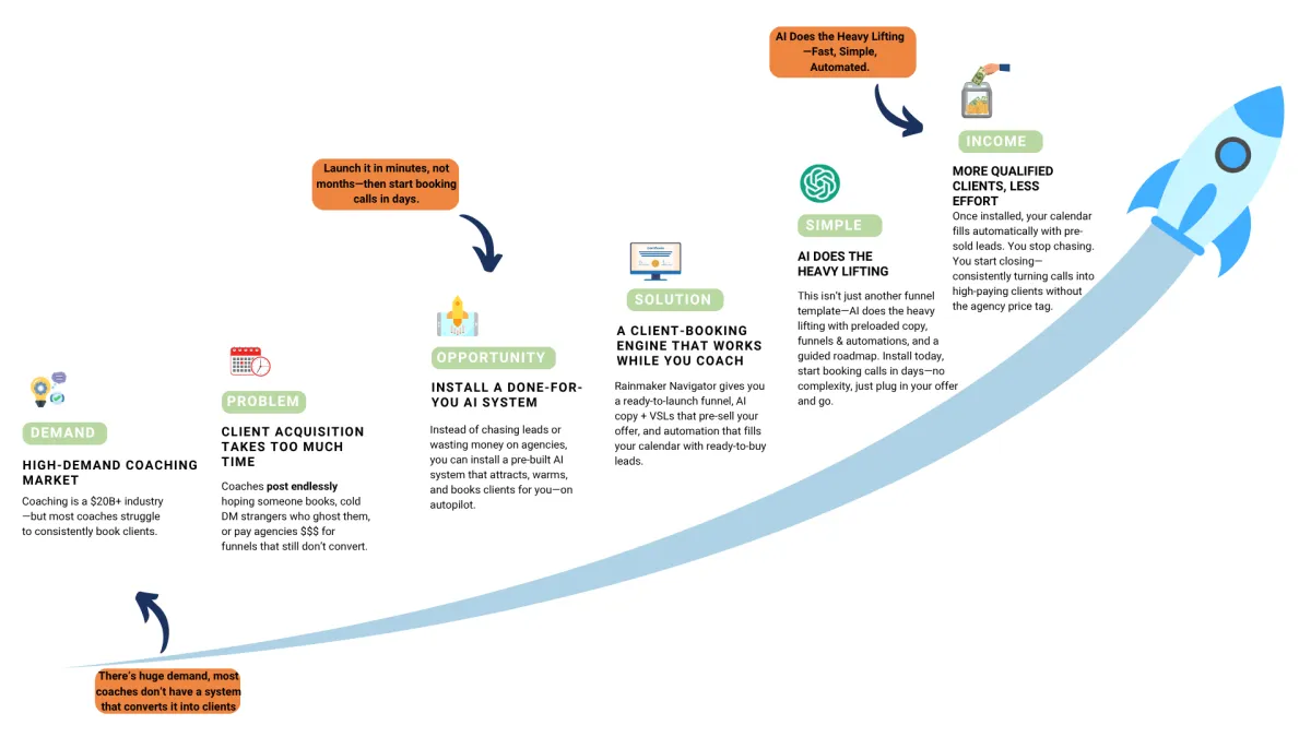 Rainmaker Navigator is for any Coach or Business Owner, with a High-Ticket product, who needs sales calls. If you want these sales calls to book into your calendar, automatically, this system is for you.